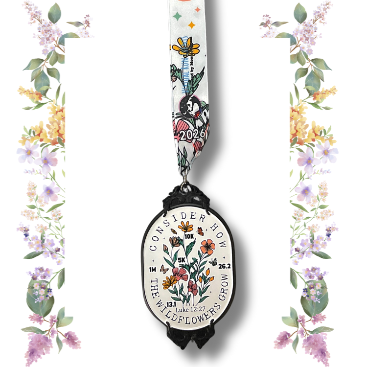 This stunning medal features delicate wildflowers, butterflies, and the comforting words of Luke 12:27. It’s designed to inspire calm, gratitude, and faith — a beautiful keepsake you’ll treasure long after your miles are complete.